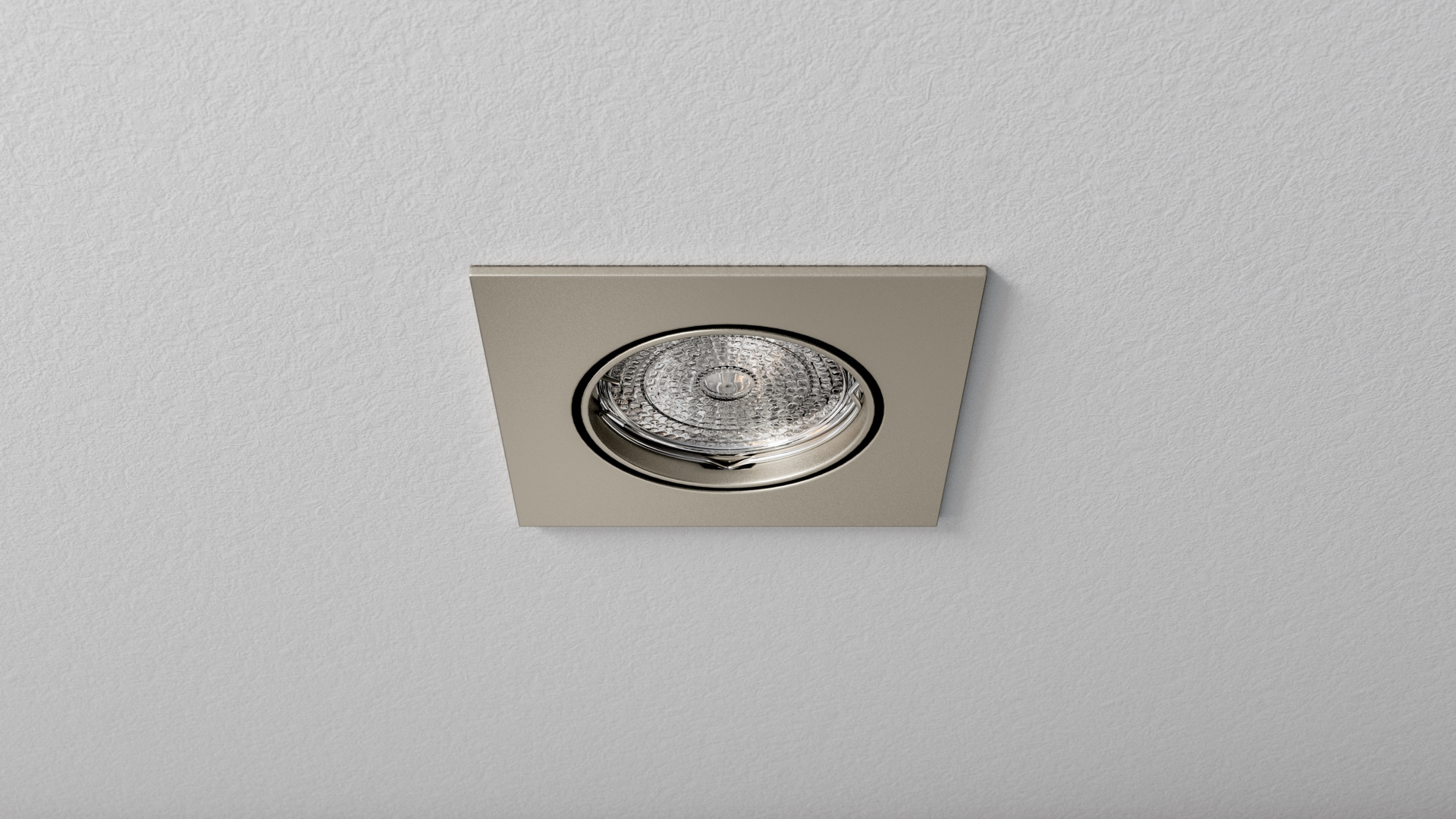 Tip architekta: Pohyblivé stropní svítidlo umožňuje nastavit úhel dopadu světla. Umožňuje osvítit místa, jako jsou prostory mezi skříňkami, pomocí světelného zdroje přímo na stropě. Hliník s matným provedením a klasický plochý čtvercový tvar se dobře hodí do snížených stropů nebo závěsných ostrůvků, kde každý centimetr vzdálenosti od stropu může mít svou hodnotu.