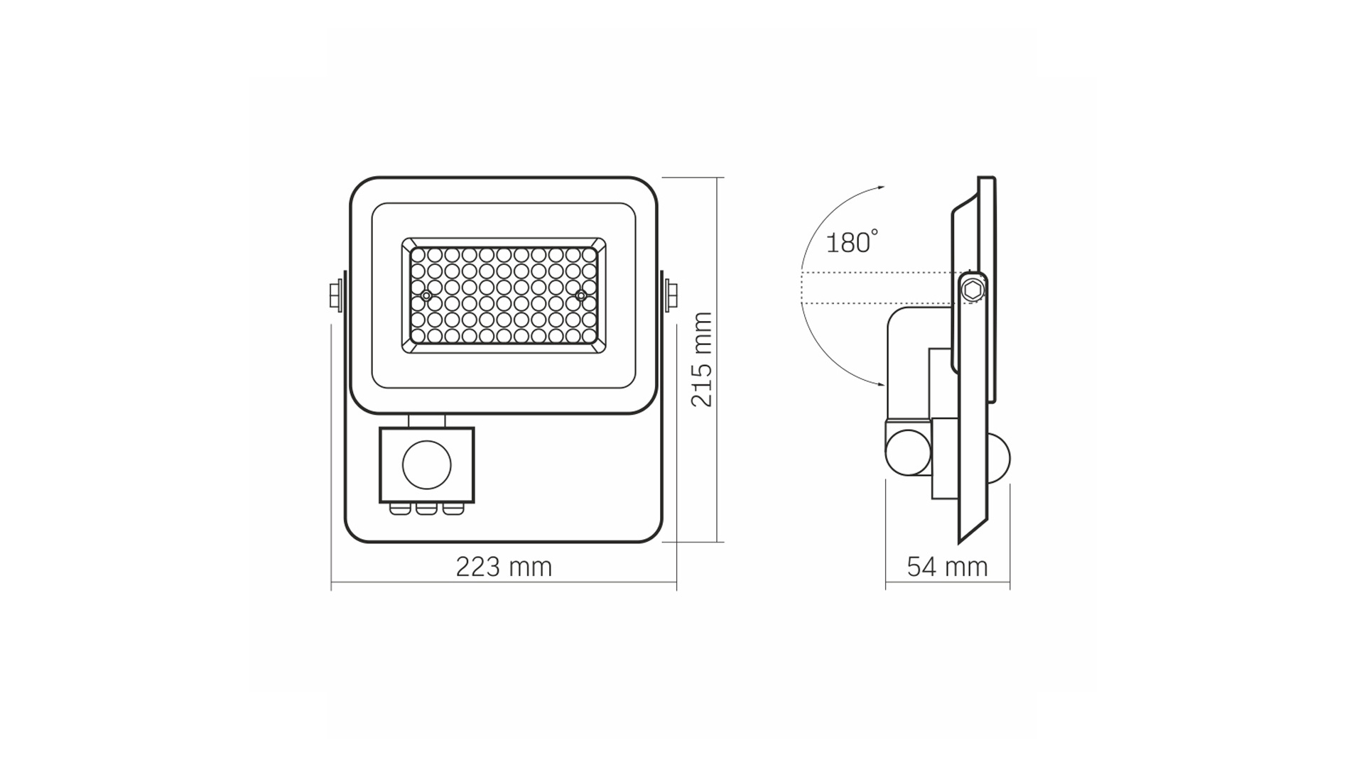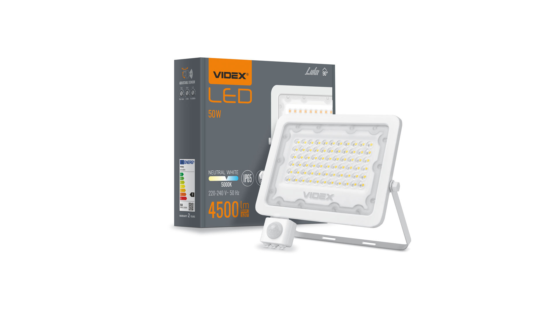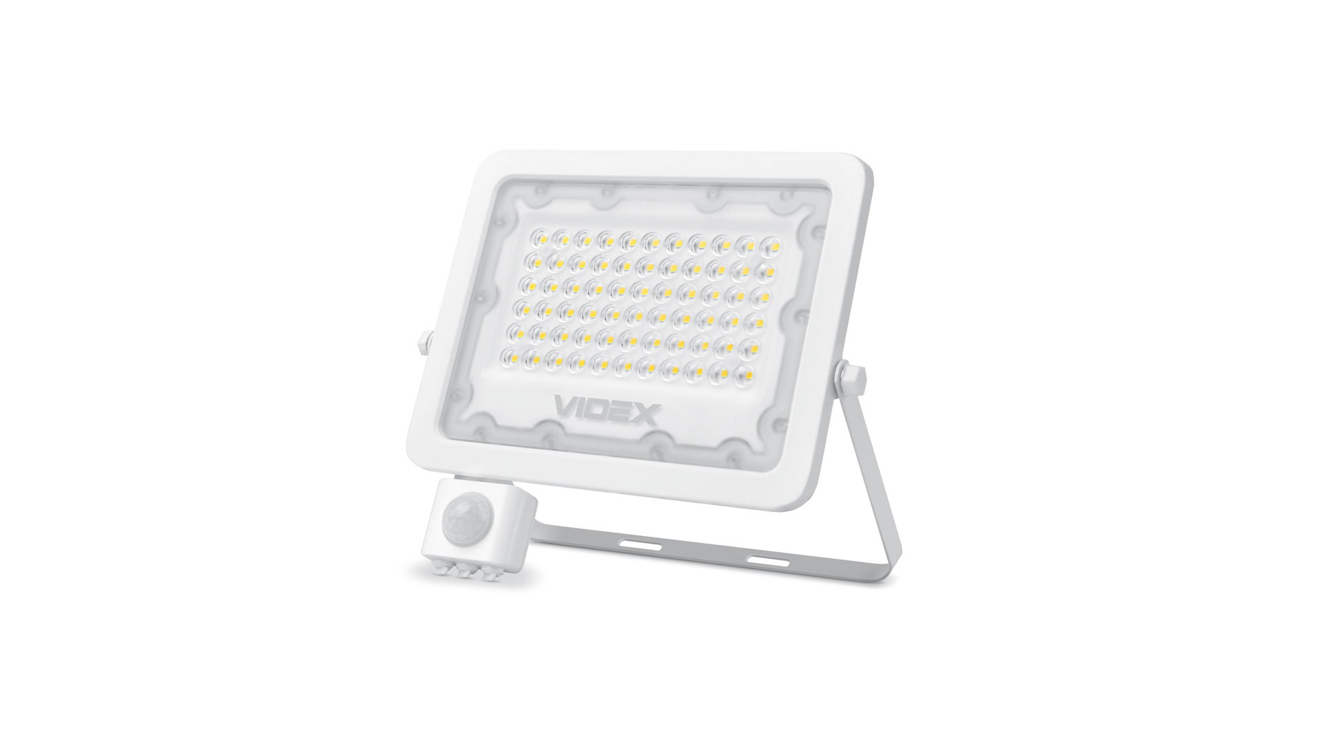Reflektor LED VIDEX s pohybovým senzorem. Má pevné pouzdro vyrobené z litého hliníku a polykarbonátový difuzor. Třída těsnosti IP65 a odolnost proti mechanickým nárazům IK07 umožňují použití reflektoru na místech vystavených povětrnostním podmínkám. Infračervený pohybový senzor lze vertikálně a horizontálně nastavit (bez změny polohy reflektoru). Senzor má úhel detekce 120 stupňů, čas zpoždění, detekční vzdálenost a úroveň okolního osvětlení lze nastavit. Diody LED s teplotou chromatičnosti 5000 K vyzařují světlo se odstínem mezi teplou a studenou bílou.