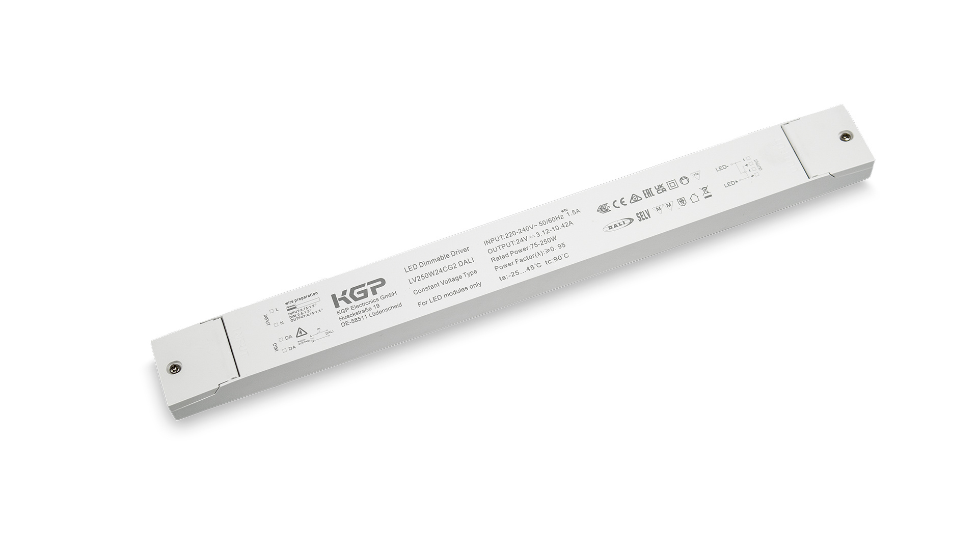 Napájecí zdroje KGP 48 V DC LV250W48CG2 se vyznačují kompaktní velikostí, štíhlým designem a nízkou hmotností. Tyto vlastnosti umožňují instalaci i v nejnáročnějších prostorech. Jejich parametry umožňují skrytou montáž, což zajišťuje esteticky příjemné provedení. Vysoká účinnost a nízký nárůst teploty minimalizují spotřebu energie a prodlužují životnost napájecího zdroje. Napájecí zdroj s krytím IP20 je určen pro vnitřní použití. Napájecí zdroje KGP 48 V DC vyhovují mezinárodním standardům pro osvětlení a jsou vybaveny ochranou proti zkratu, nadproudu, přepětí a tepelnou ochranou.