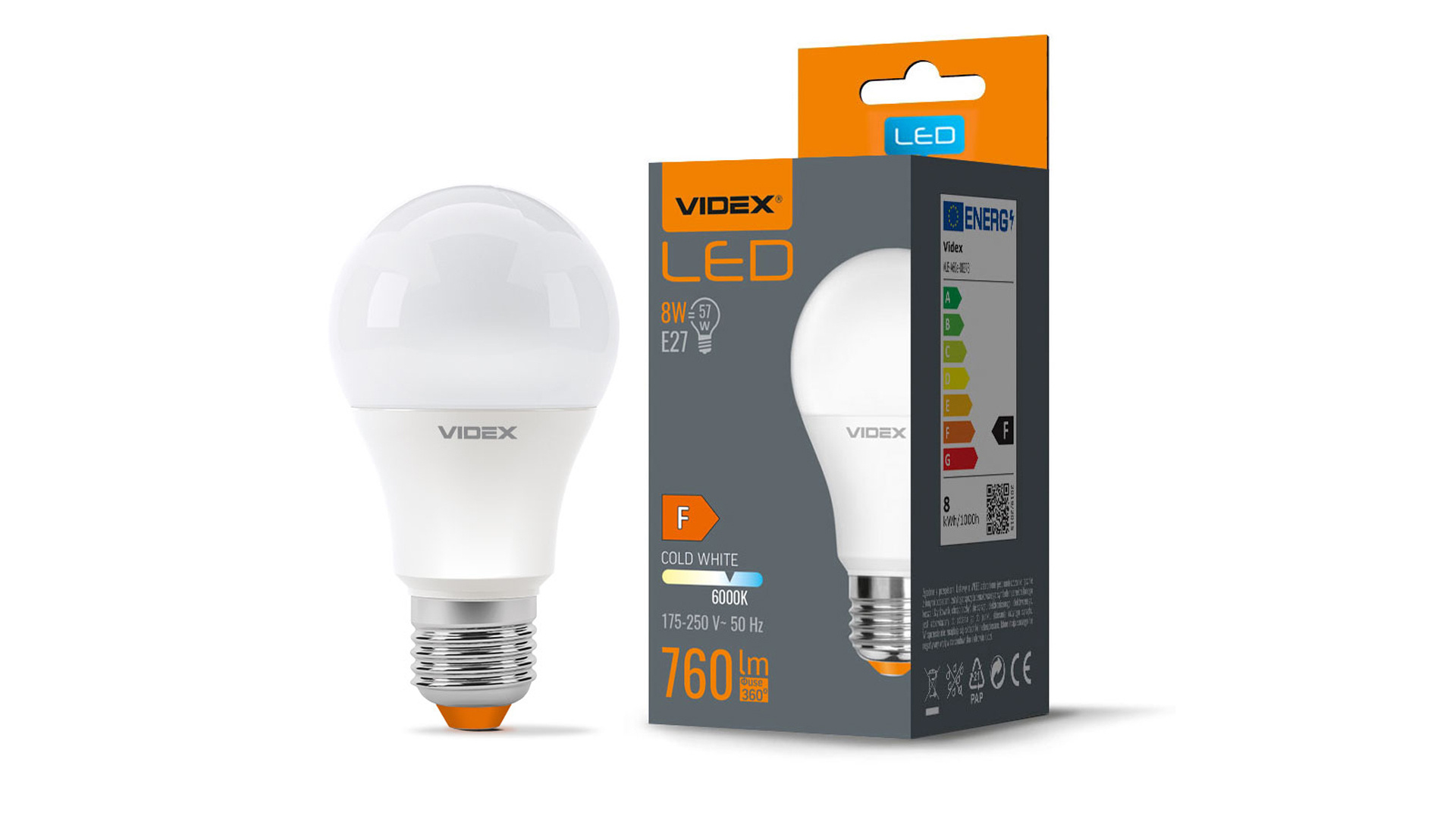 Žárovka E27 LED s výkonem 8 W a světelným tokem 760 lumenů, studená bílá. Náhrada za tradiční žárovku 57 W. LED žárovky poskytují světlo bez blikajícího efektu, který je unavující pro oči.