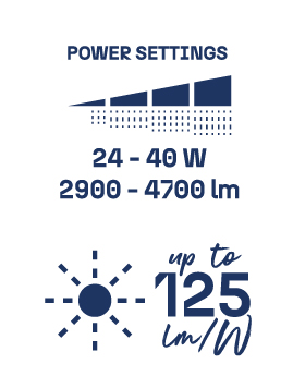 A high luminous efficacy of up to 125 lm/W allows for efficient illumination of spaces with high brightness requirements while maintaining low energy consumption, which translates into lower operating costs.