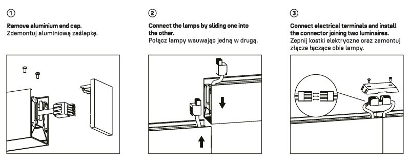 Tool-free connection, for seamless connection of lamps in a line up to 450 W.