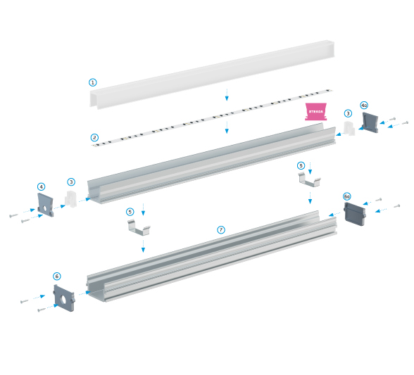 Schéma montáže prvků osvětlovací soustavy s využitím LED profilu STRADA, (1) kryt SOLID, (2) LED pásek, (3) kryty TAPO pro kryt SOLID, (4) kryty s otvorem STRADA, (4a) kryty bez otvoru STRADA, (5) montážní konzola, (7) montážní profil STRADA M1, (6) kryty s otvorem STRADA M1 a (6a) kryty bez otvoru STRADA M1.