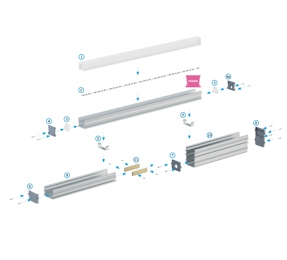 Schéma montáže prvků osvětlovací soustavy s využitím LED profilu STRADA, (1) kryt SOLID, (2) LED pásek, (3) kryty TAPO pro kryt SOLID, (4a) kryty s otvorem STRADA, (4) kryty STRADA bez otvoru, (5) montážní konzola, (9) montážní profil STRADA M1, (6) záslepka bez otvoru STRADA M1, (11) rovný konektor, (7) záslepka s otvorem STRADA M3-M1, (10) montážní profil STRADA M3 a (8) záslepka bez otvoru STRADA M3