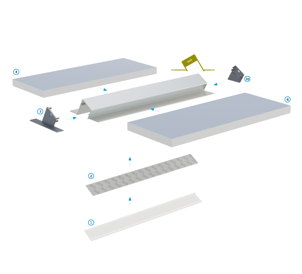 Schéma montáže prvků osvětlovacího systému s využitím zabudovaného profilu DUO, krytu DOUBLE, LED pásů, koncovek