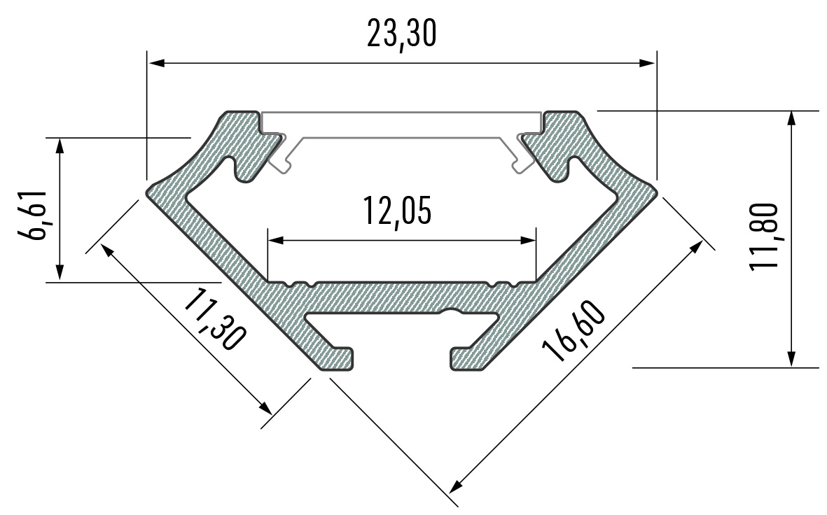 C Lumines hliníkový profil v rohu s úhlem náklonu 45 stupňů LED. Jeden z nejmodernějších a minimalistických designů. Vynikající pro designérskou kombinaci dvou na sebe kolmých ploch a kdekoli je potřeba směrovat světlo vycházející z profilu v úhlu 45 stupňů.
