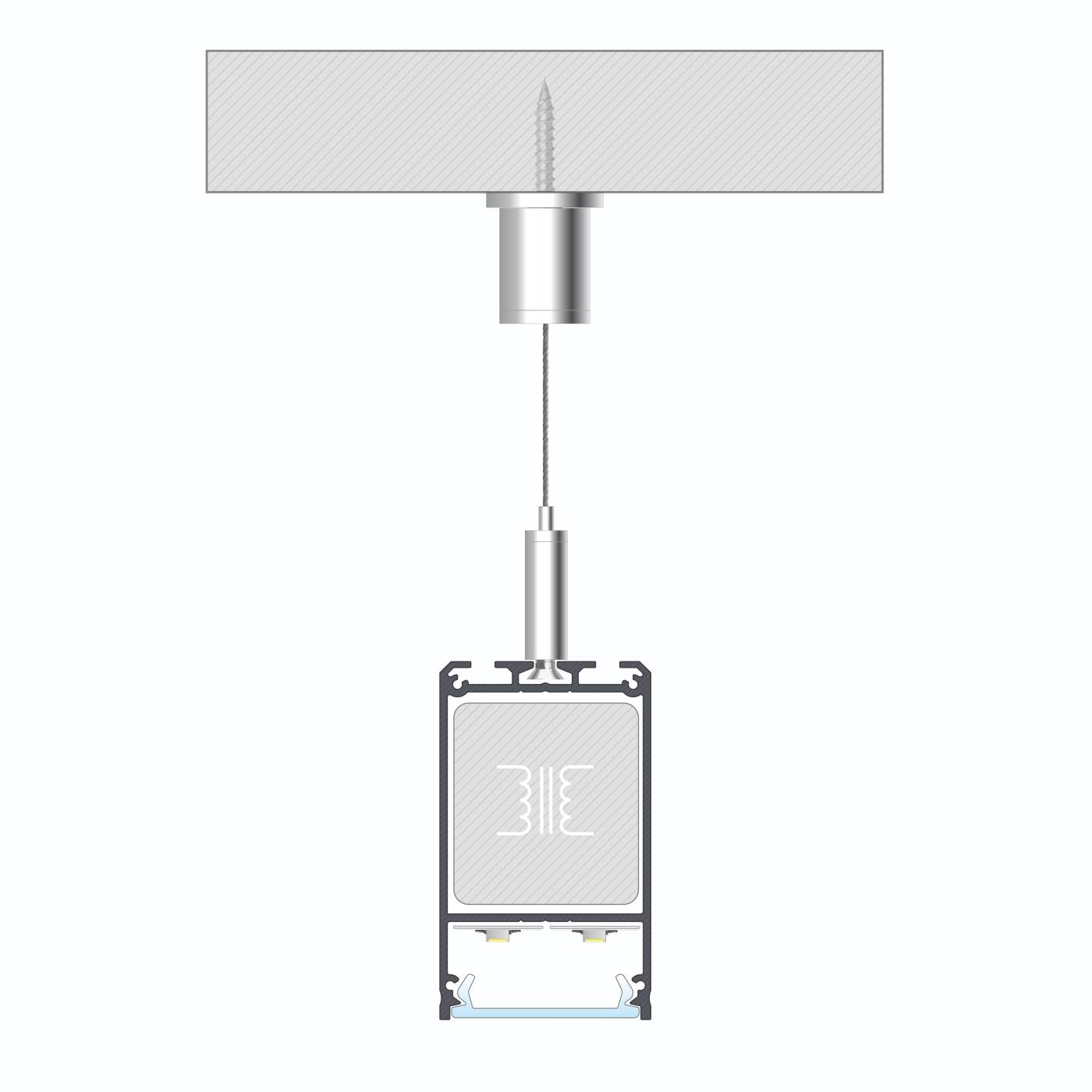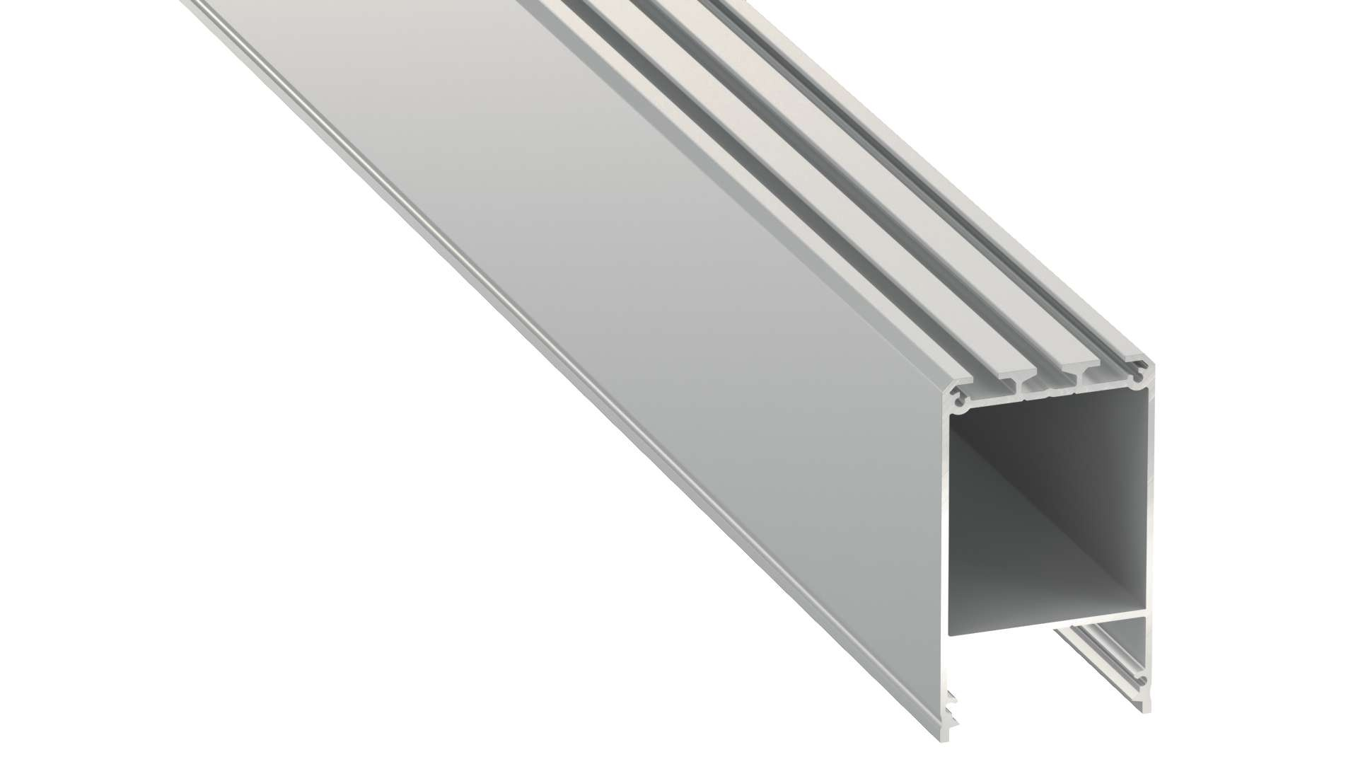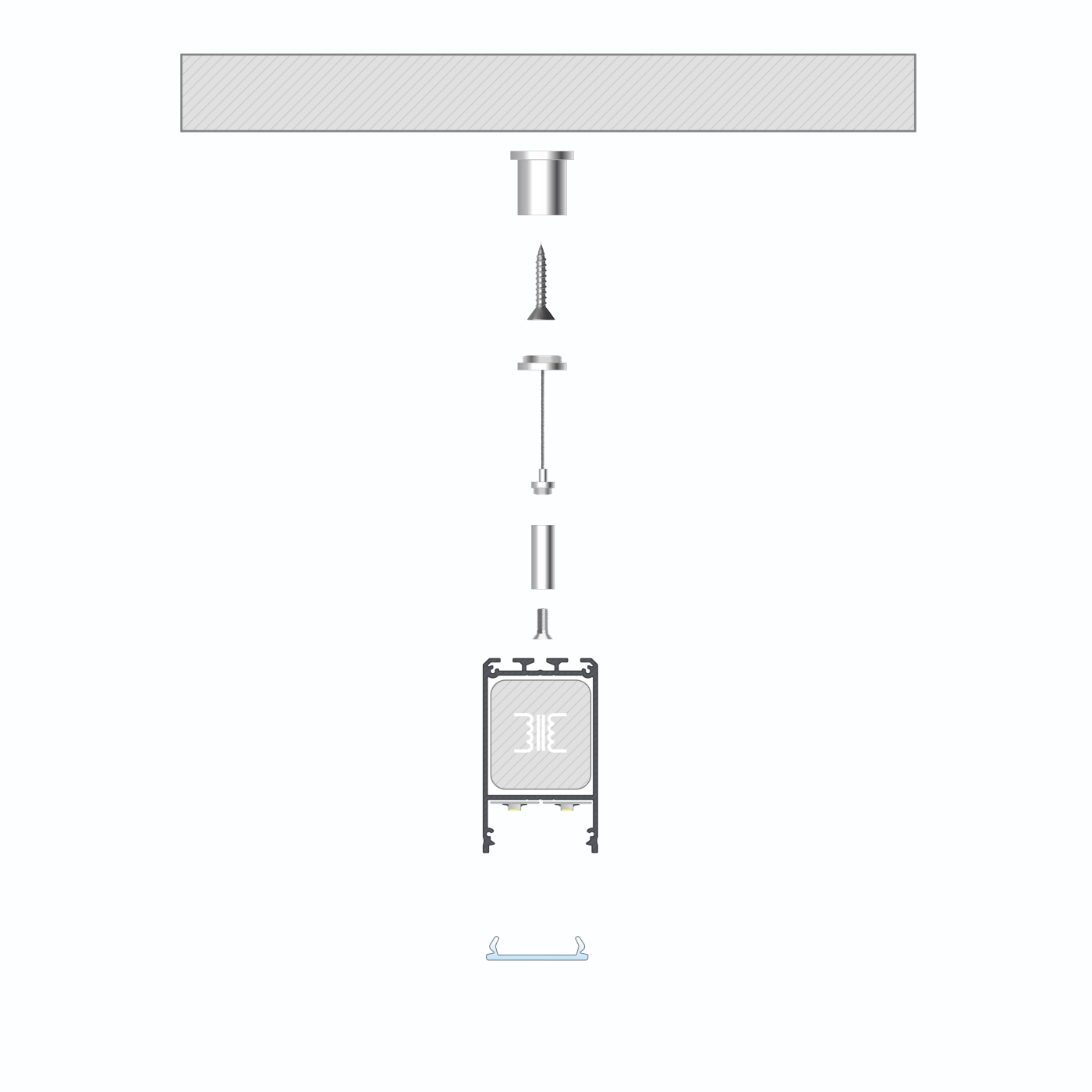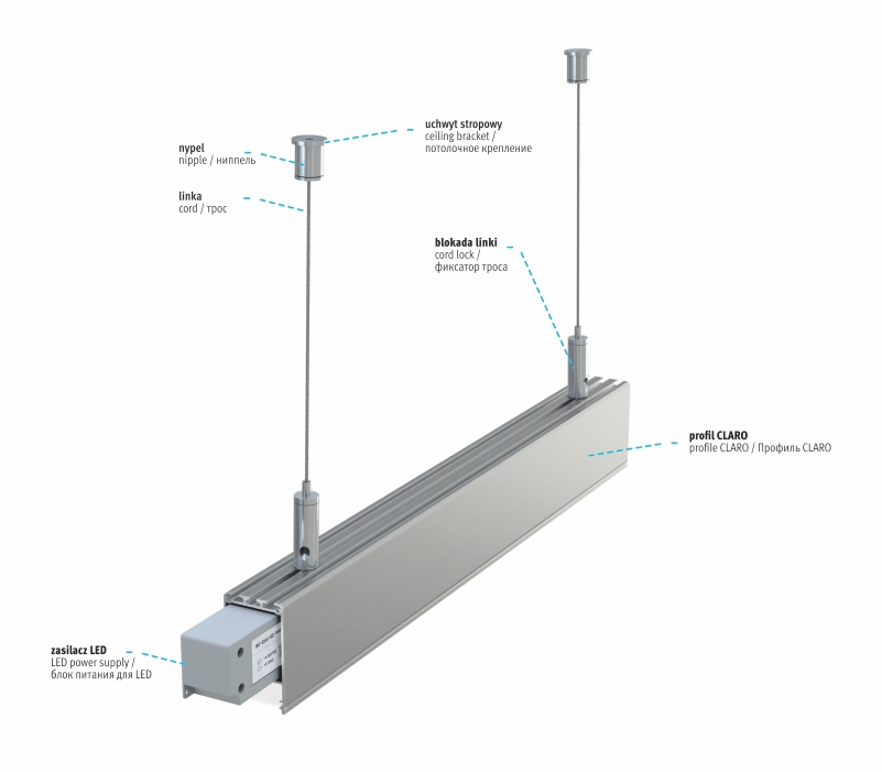 Výsledek montáže profilu CLARO s ukrytým zdrojem napájení pomocí závěsů a krytu WIDE