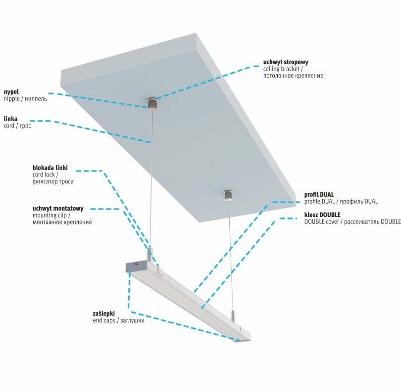Diagram sestavení prvků osvětlovacího systému s použitím profilu DUAL a (1) krytu DOUBLE, (2) LED pásků, (3) koncových krytů s výřezem.