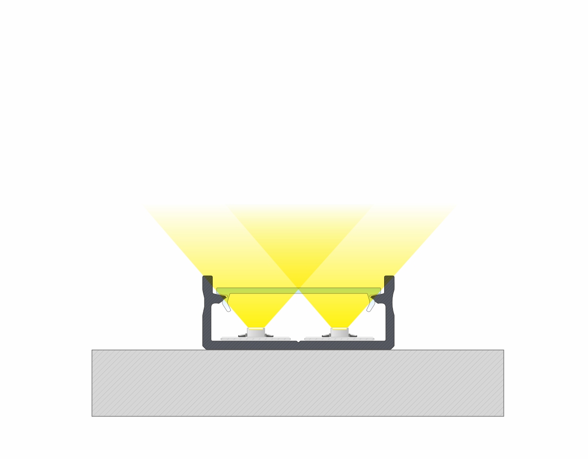 Profil LUMINES DUAL je nízký, povrchově montovaný profil pro dvě řady LED pásku. Profil lze namontovat pomocí kovových montážních spon.