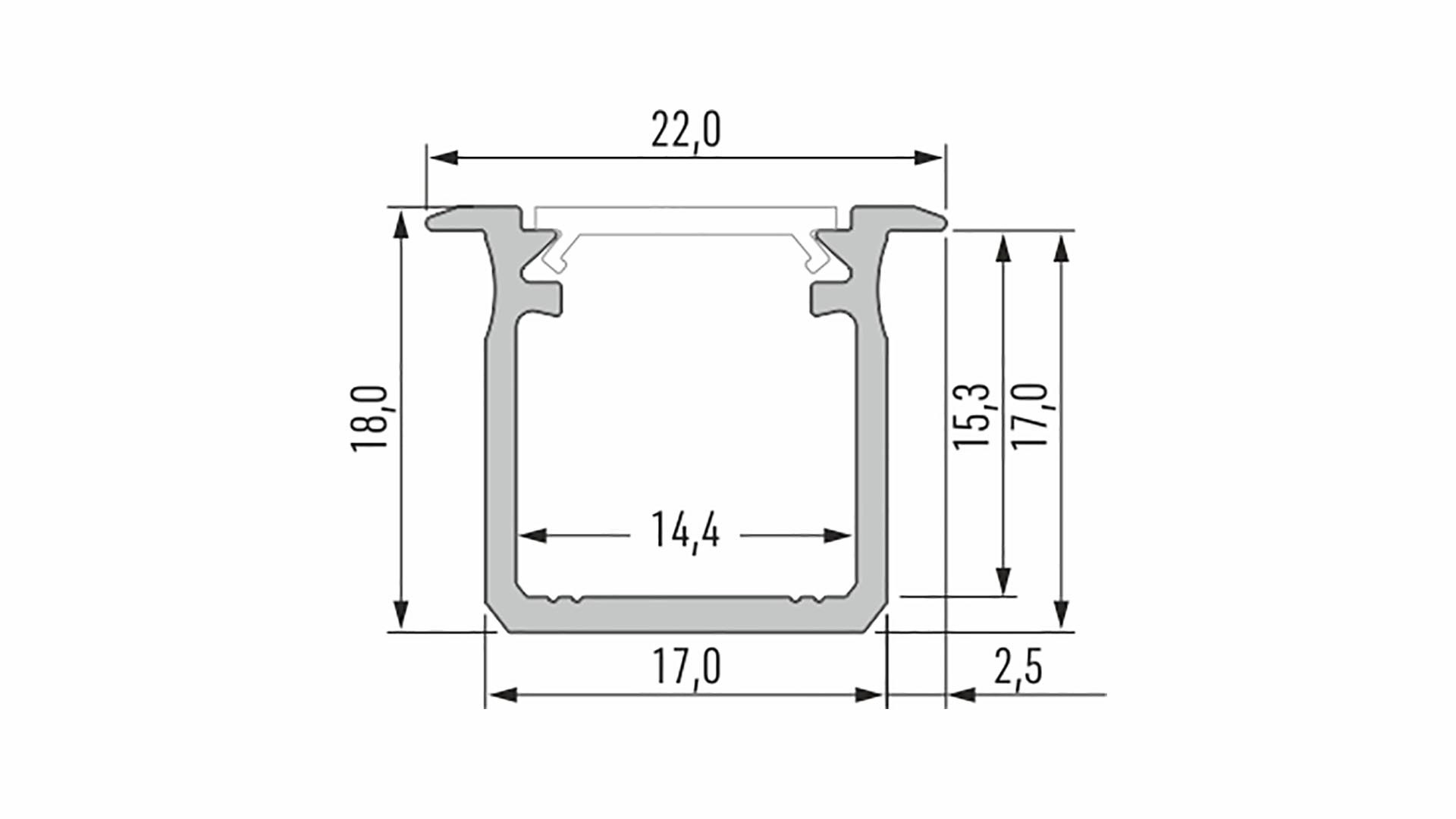 Profil typu G Lumines se zapuštěnou montáží. Určený pro osvětlení kuchyní a obchodů. Vhodný pro montáž uvnitř skříní, na pracovní desky a schody.