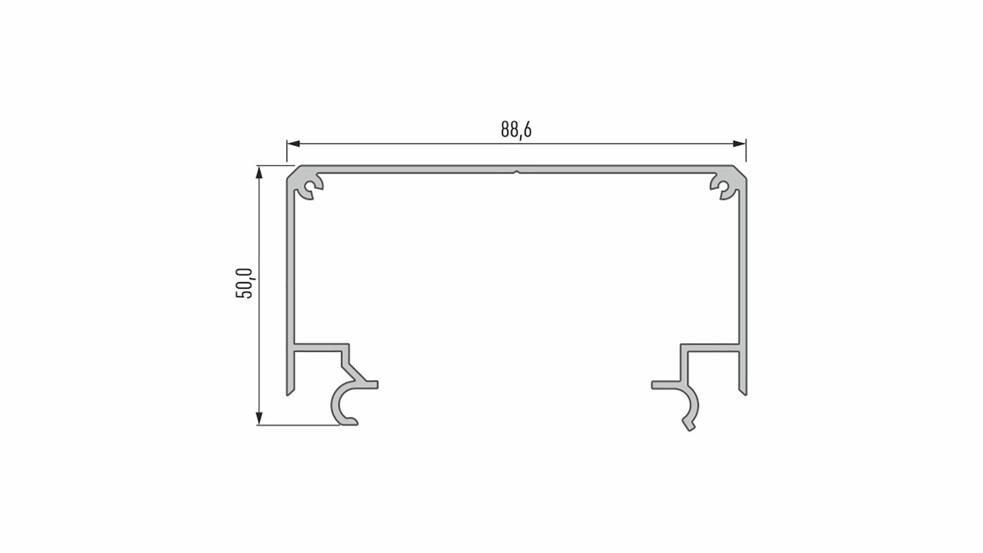 Konečný výsledek montáže profilu LARGO se šířkovou krytkou za použití montážního profilu LARGO M2 pro skrytí napájecího zdroje uvnitř