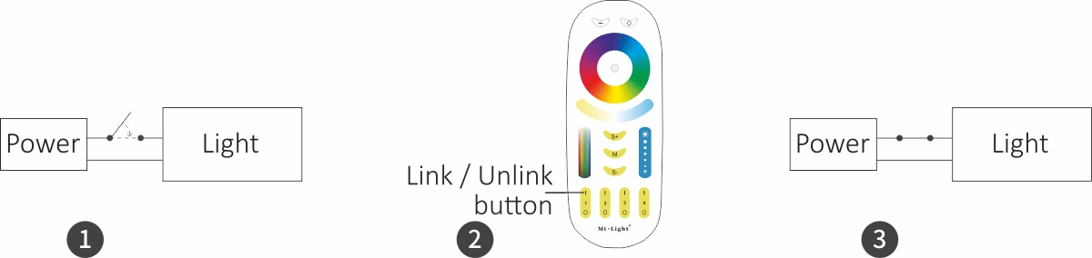 Spárování dálkového ovladače s přijímačem je mimořádně jednoduché. Měli byste odpojit hlavní napájení od přijímače (1), poté napájení znovu připojit a během prvních 3 sekund krátce stisknout dříve vybraný kanál na dálkovém ovladači (2). Správné spárování zařízení bude indikovat bliknutí LED pásku (3) třikrát.