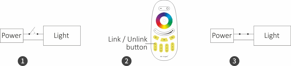 Spárování dálkového ovladače s přijímačem je mimořádně jednoduché. Měli byste odpojit hlavní napájení od přijímače (1), poté znovu připojit napájení a do 3 sekund krátce stisknout dříve vybraný kanál na dálkovém ovladači (2). Účinkem správného spárování zařízení bude třikrát bliknout LED pásek (3).