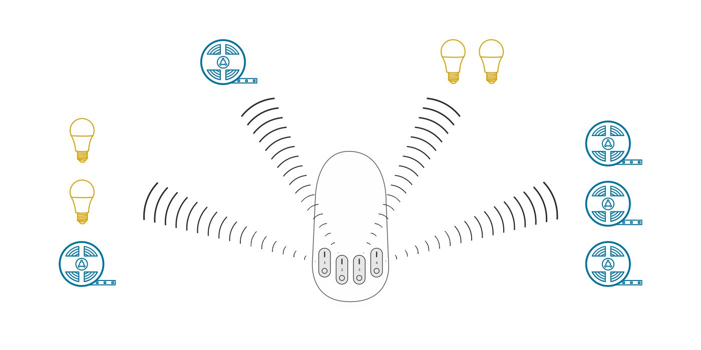 Dálkové ovládání RGB pásku vám umožňuje ovládat RGB LED pásek. Na dálkovém ovladači můžete specifikovat 4 nezávislé zóny a každé zóně lze přiřadit libovolný počet přijímačů řady MiBoxer (prodávají se samostatně). Možnosti konfigurace jsou prakticky neomezené.