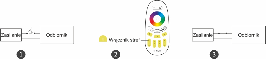 Spárování dálkového ovladače s přijímačem je mimořádně jednoduché. Je třeba odpojit hlavní napájení od přijímače (1) a poté napájení znovu připojit, kde během prvních 3 sekund krátce podržíte příslušný kanál na dálkovém ovladači (2). Důsledkem správného spárování zařízení bude trojité bliknutí LED pásku (3).
