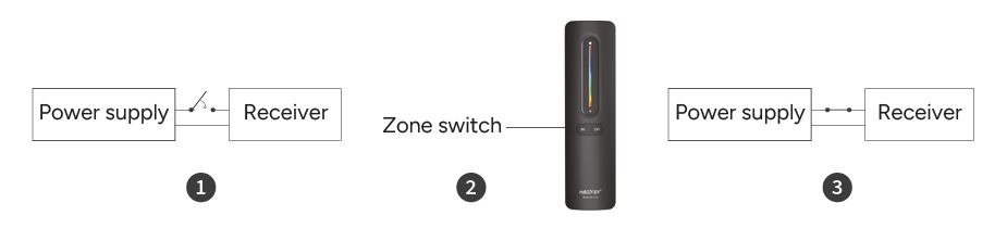 Pairing the remote control with the receiver is extremely simple. You should disconnect the main power supply from the receiver (1), then reconnect the power supply and, within the first 3 seconds, briefly hold down the previously selected channel on the remote control (2). The effect of correct pairing of the devices will be the LED strip (3) blinking three times.