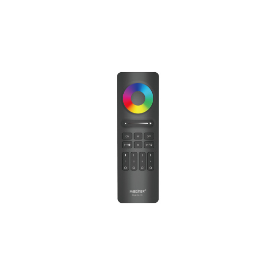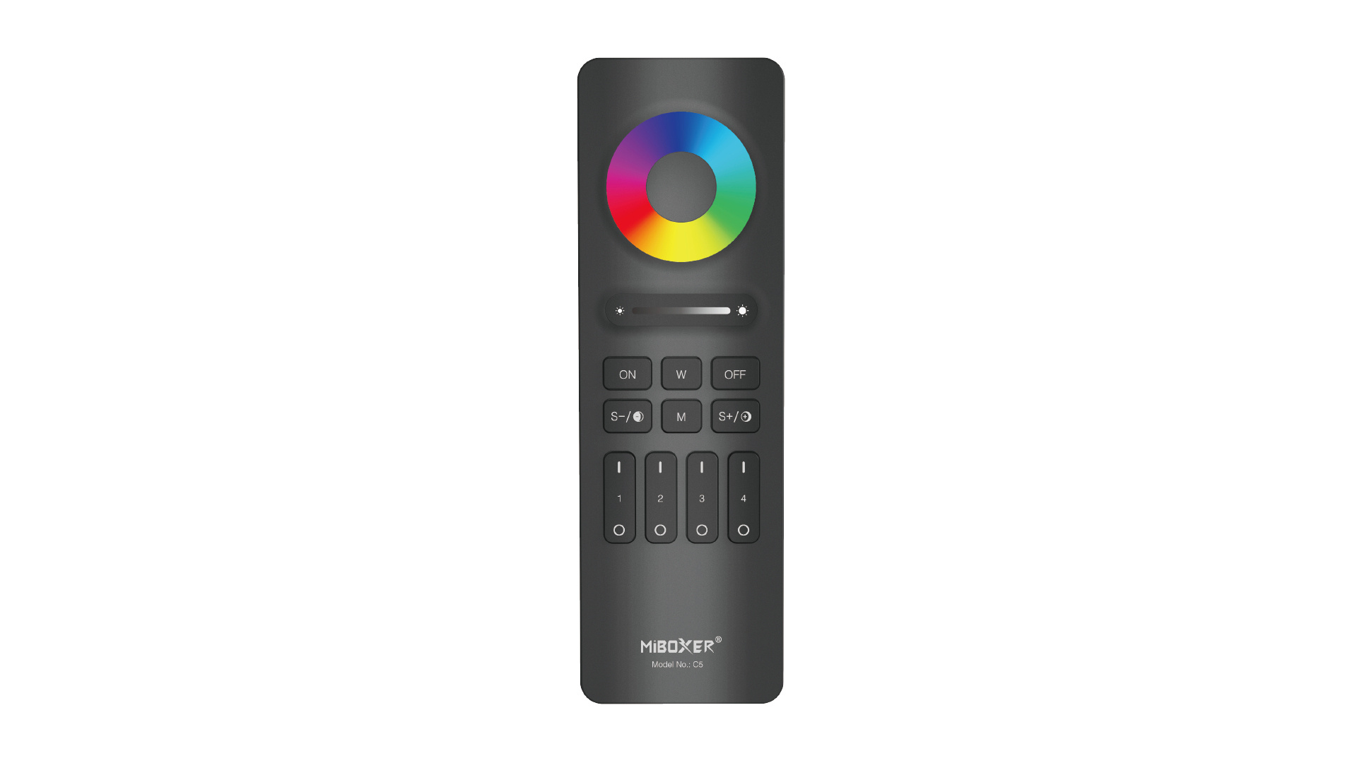 MiBOXER C5 controller enables remote control of brightness, color temperature, and RGB colors of LED lighting. It operates on RF 2.4 GHz wireless technology, ensuring a stable connection with MiBoxer/Mi-Light receivers and luminaires within a range of up to 30 metres.