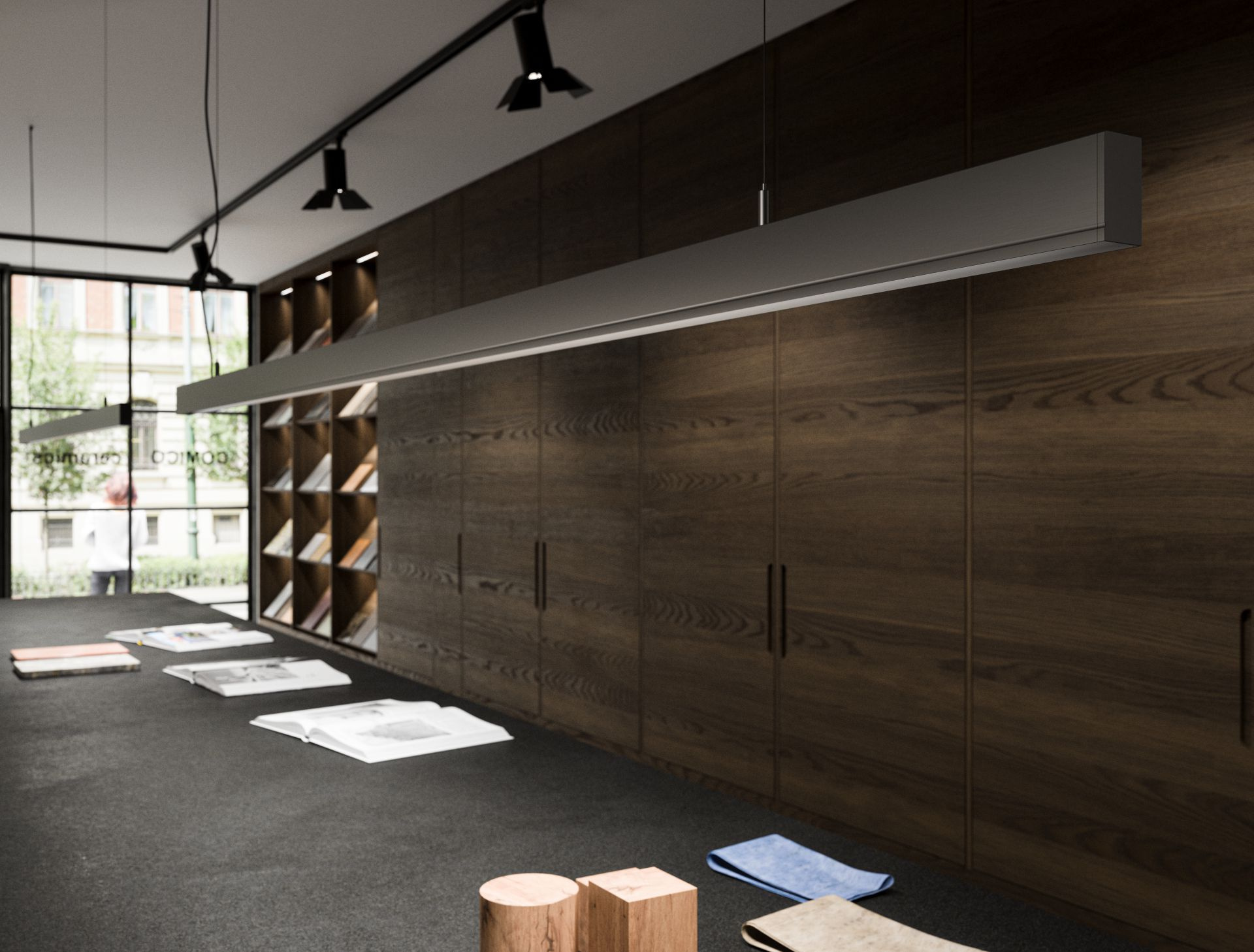 Zavěšený systém LED s vestavěným napájecím zdrojem. Kloubový design profilu umožňuje snadný servis aVíce