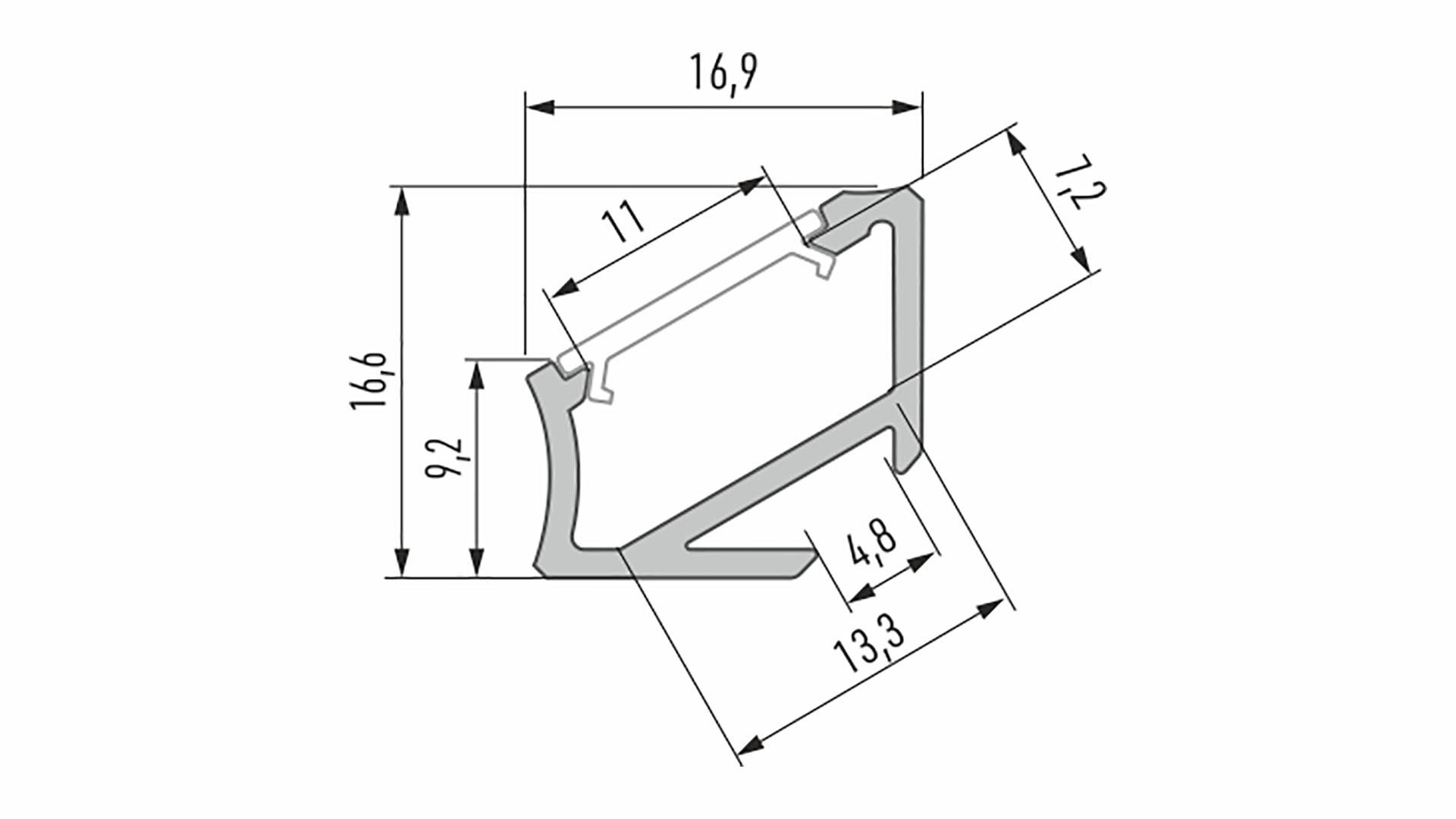 Profil H je hliníkový profil s úhlopříčným povrchem 30/60. Osvětluje kuchyně, prosklené vestavby, pracovní desky. Asymetrická konstrukce umožňuje aplikovat různé úhly osvětlení.