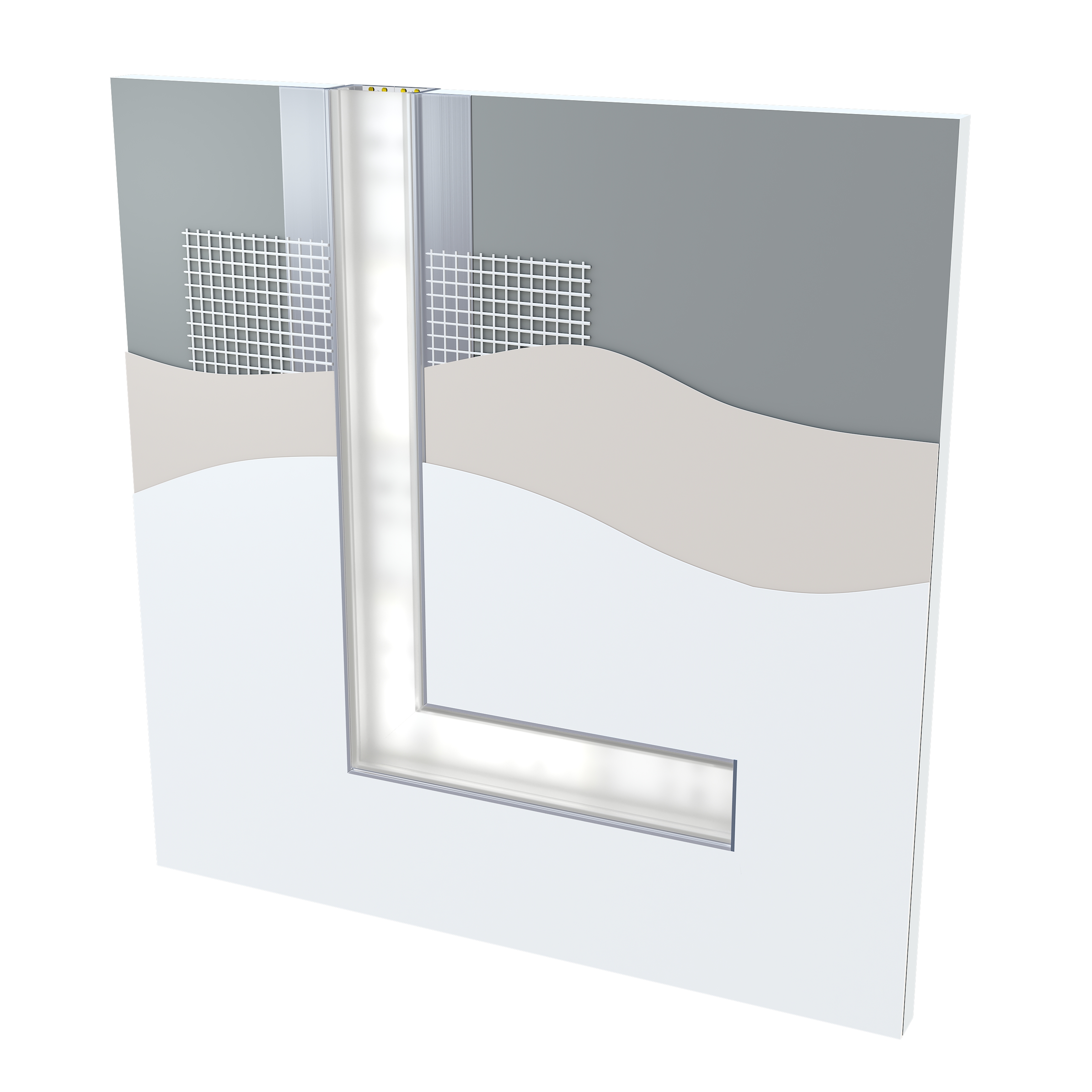 Výsledek montáže profilu HIRO s krytem DOUBLE, zabudovaný mezi dva sádrokartonové panely s omítnutým finišem
