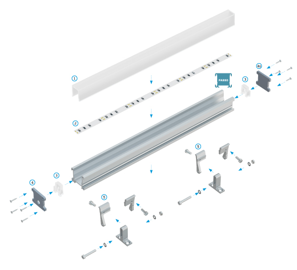 Schéma sestavení prvků osvětlovacího systému s použitím FASSO LED profilu, kryt SOLID, LED pásek, TAPO čepičky na kryt FASSO, čepičky s otvorem, čepičky bez otvoru a rukojeť FASSO montážní svorky