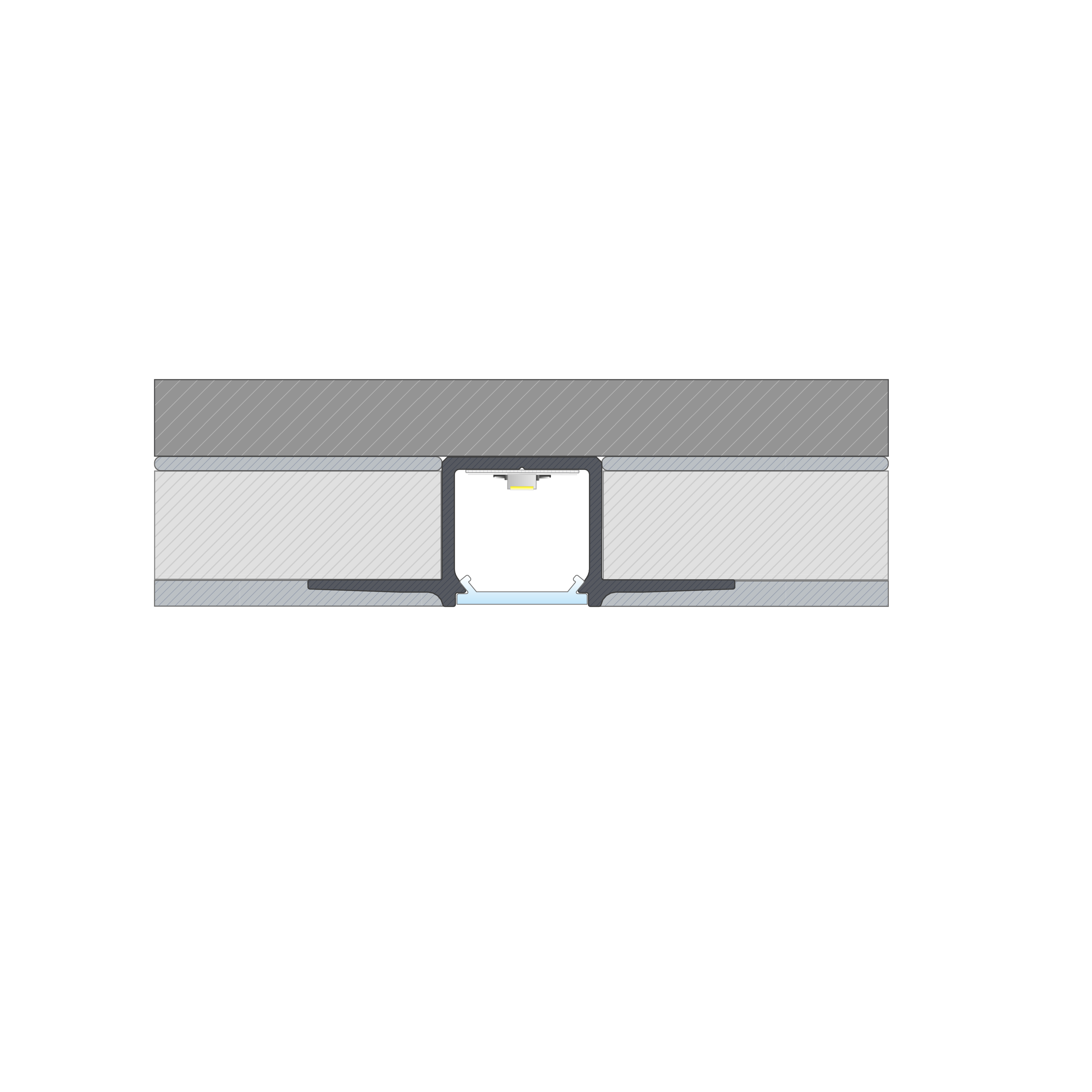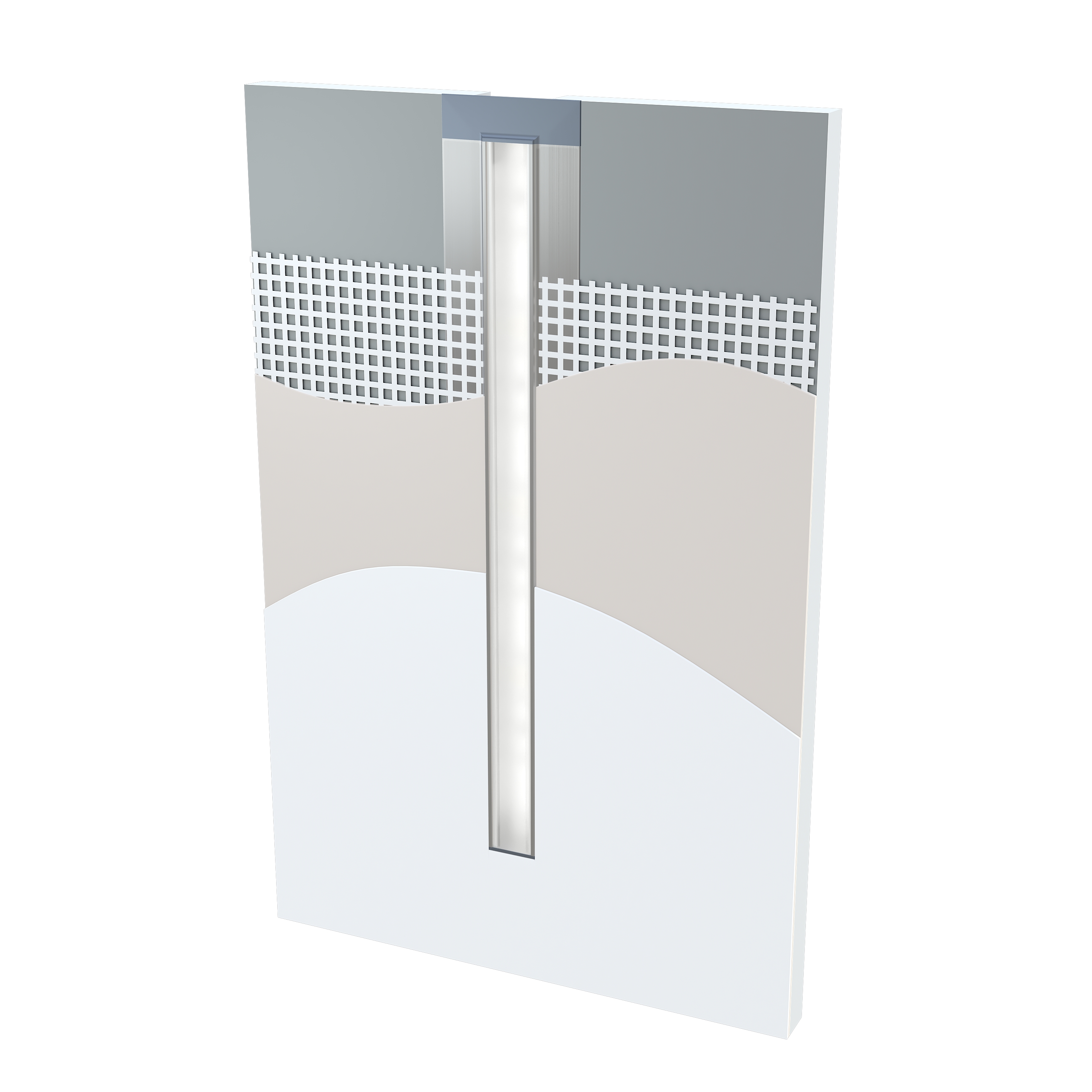 Výsledek montáže profilu GAUDI s BASIC krytem, zapuštěný mezi dvě sádrokartonové desky s omítnutým povrchem
