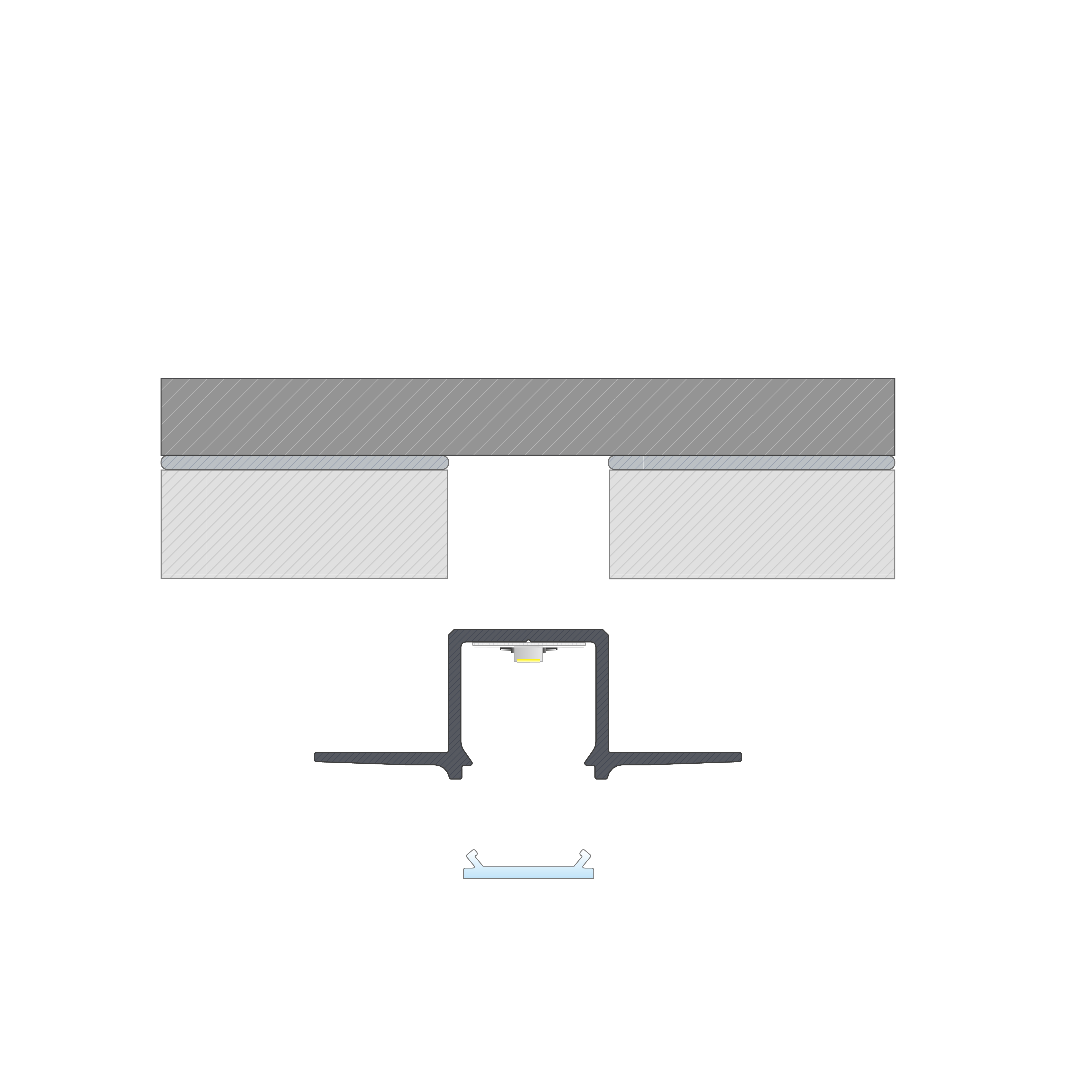 Schéma montáže prvků osvětlovacího systému pomocí zapuštěného profilu GAUDI (1) BASIC kryt, (2) LED pásky, (3) koncové krytky GAUDI