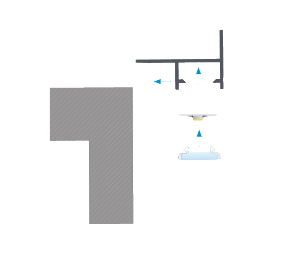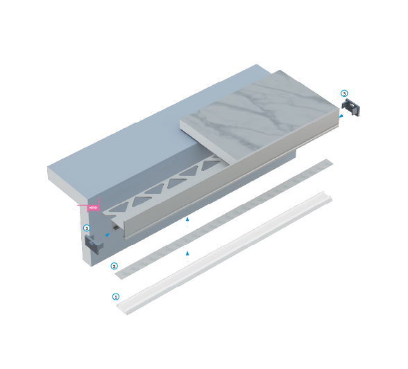 Schéma sestavy prvků osvětlovacího systému na stropě s použitím profilu MITO a (1) krytu BASIC (2), LED pásku a (3) koncové krytky s otvorem.