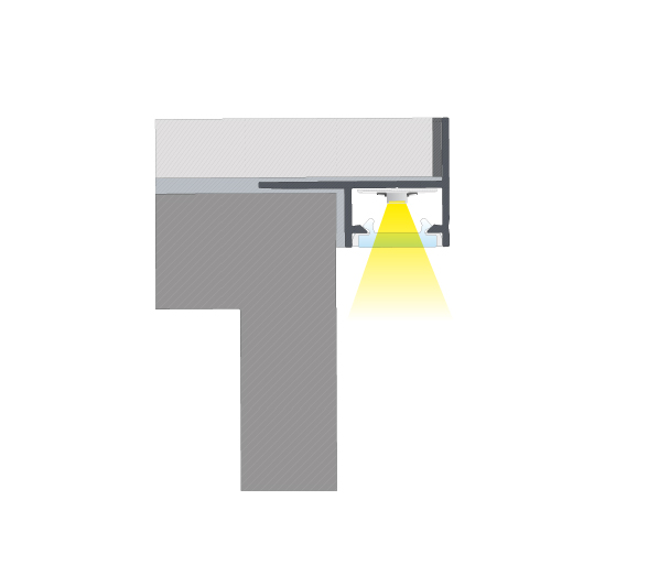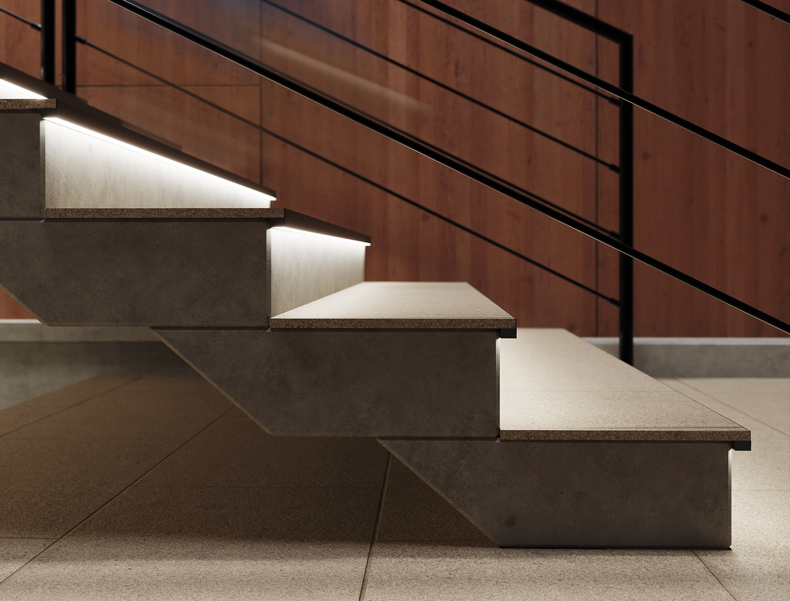 Profil schodů pro dlaždice, lepený pod keramickou dlažbou s jedním děrovaným listem a krytem s krytím IP54. Pro použití jako osvětlení pro zvýraznění.
