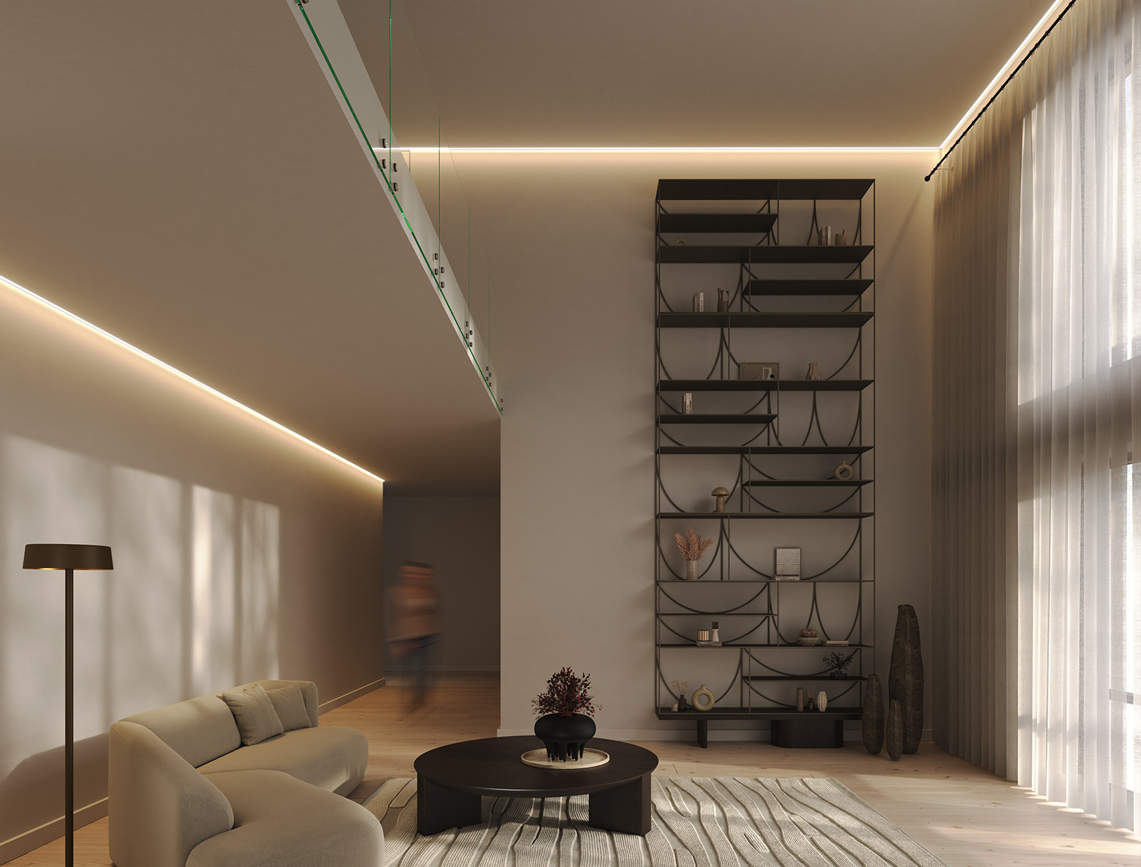 Stropní a nástěnný profil pro omítání. Pro použití jako dekorativní osvětlení s dvojitým LED pásem.