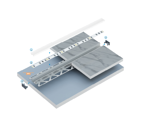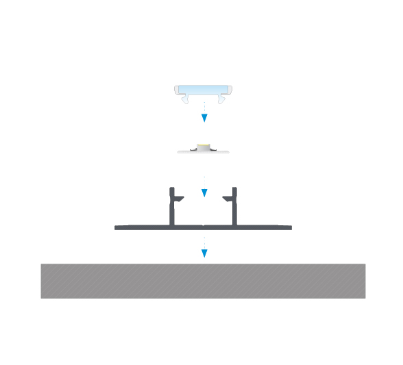 Schéma sestavení prvků osvětlovacího systému do stropu pomocí profilu NIPO a (1) krytu BASIC (2), LED pásku a (3) koncové krytky s otvorem.