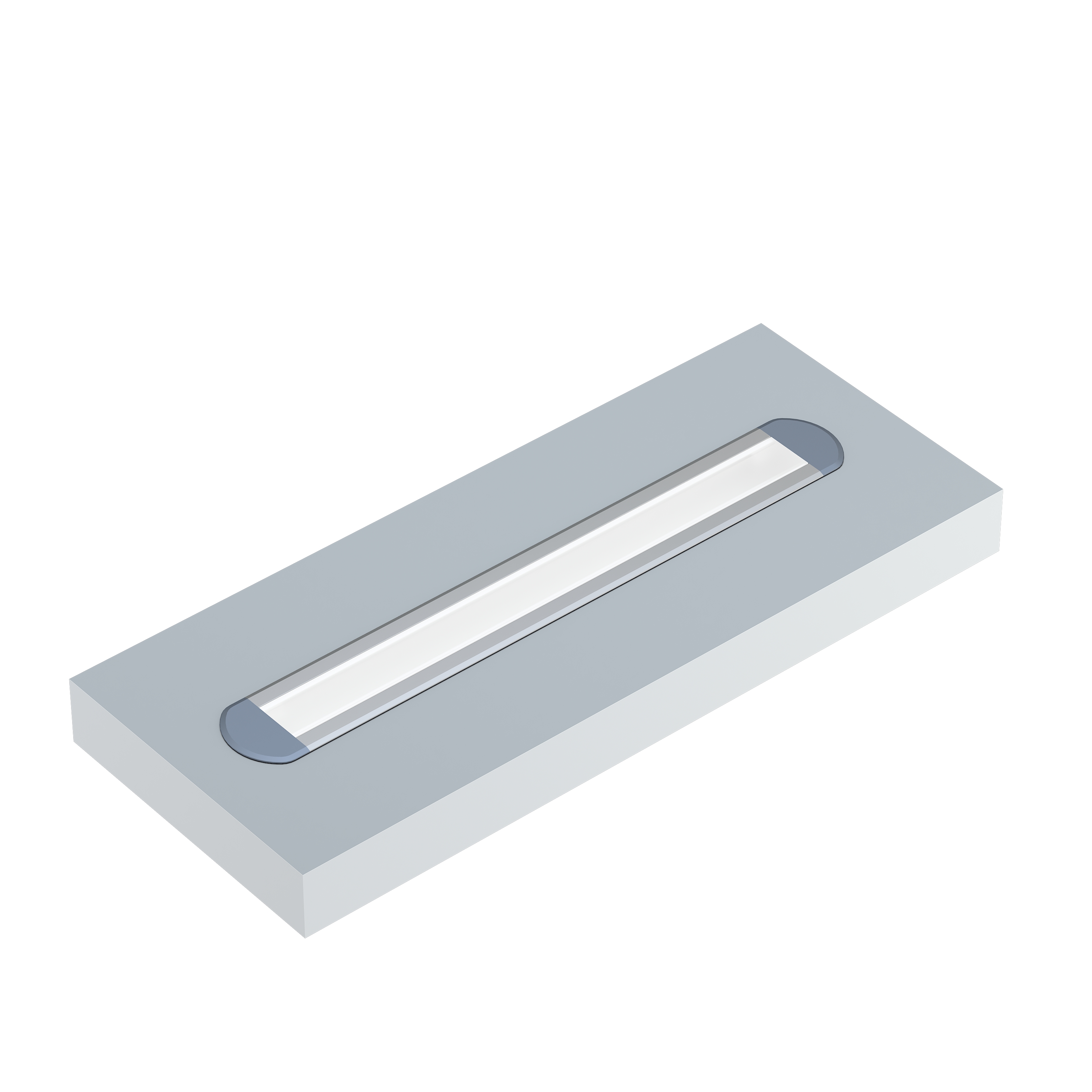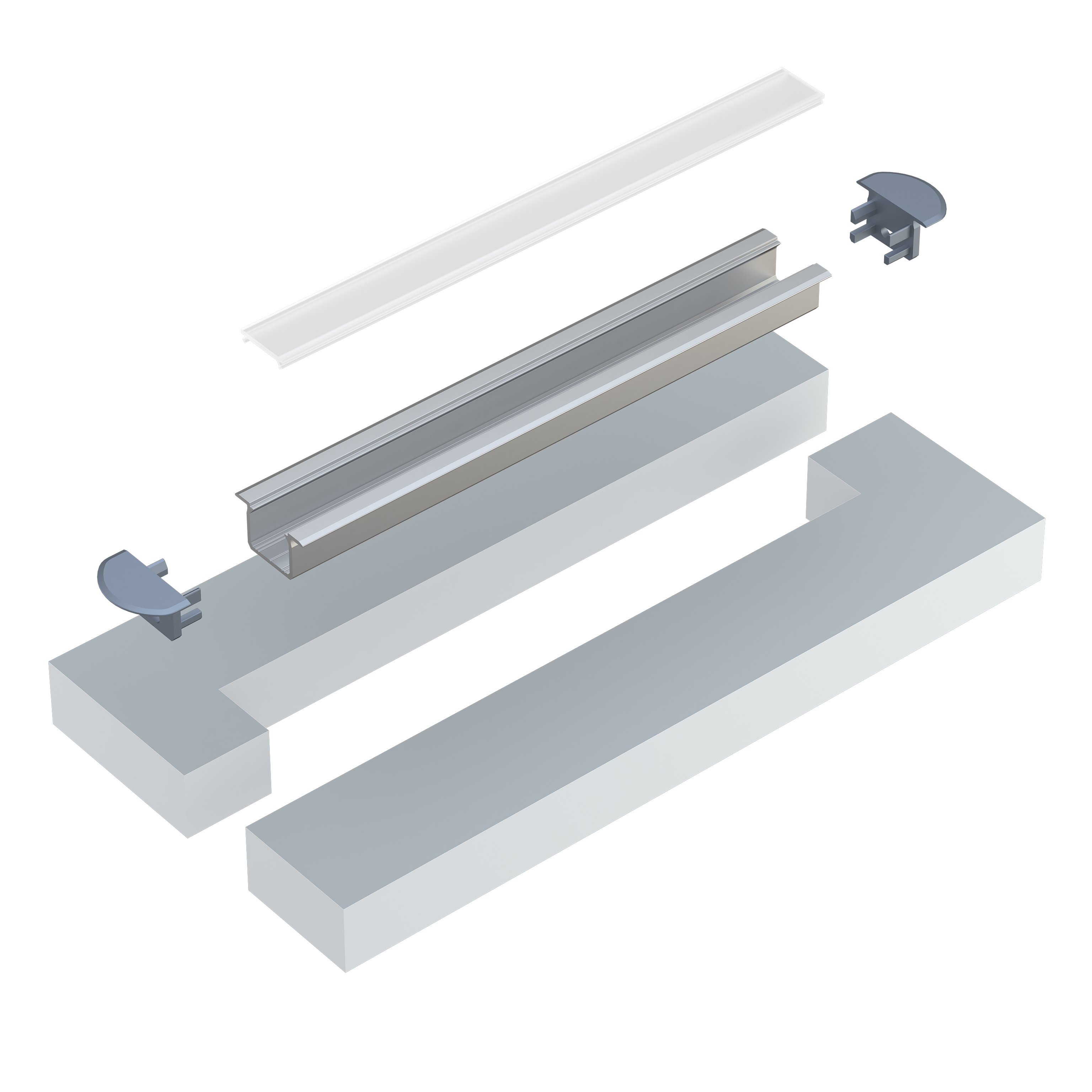 Axonometrický pohled před montáží profilu U do 12mm desky nábytku s BASIC krytem a bočními krytkami