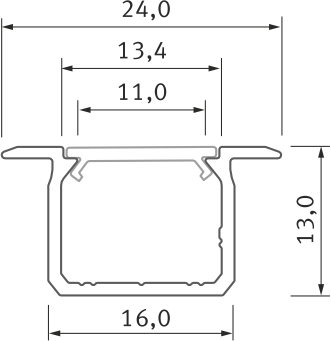 Zapuštěný, nakloněný nábytkový profil pro suchou instalaci. Vhodný pro osvětlení poliček a různých t