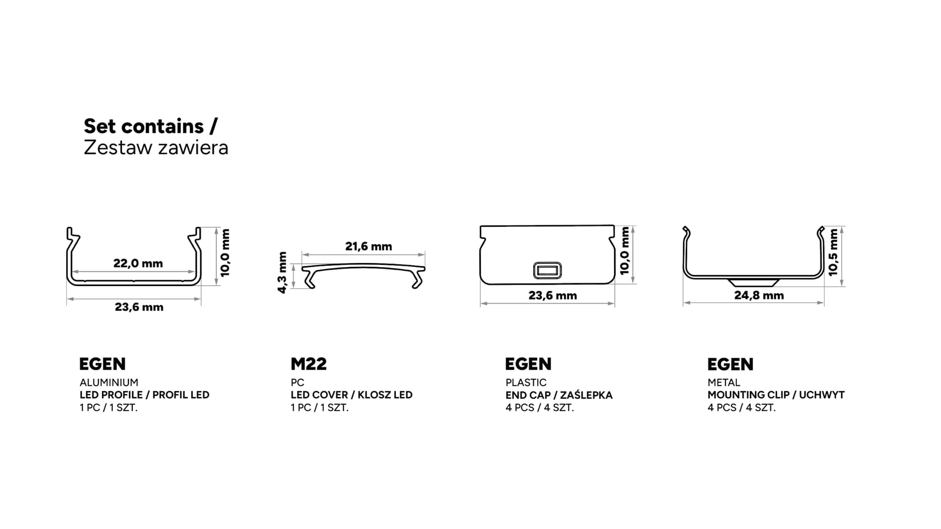 Set contains: 1 x EGEN LED profile, 1 x M22 LED cover, 4 x EGEN End cap, 4 x EGEN Mounting clip