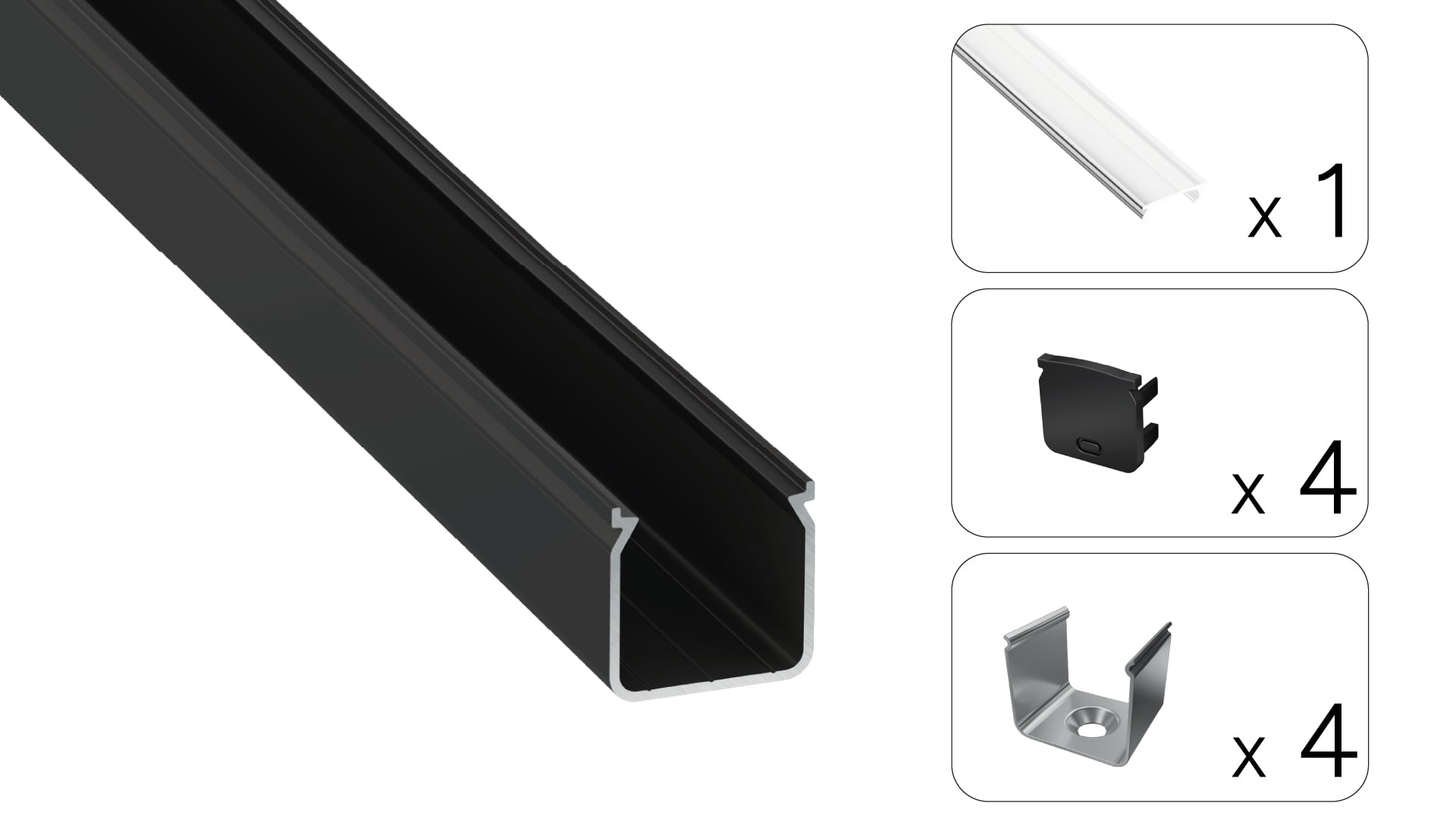 Set contains: 1 x HELSE LED profile, 1 x S14 LED cover, 4 x HELSE End cap, 4 x HELSE Mounting clip