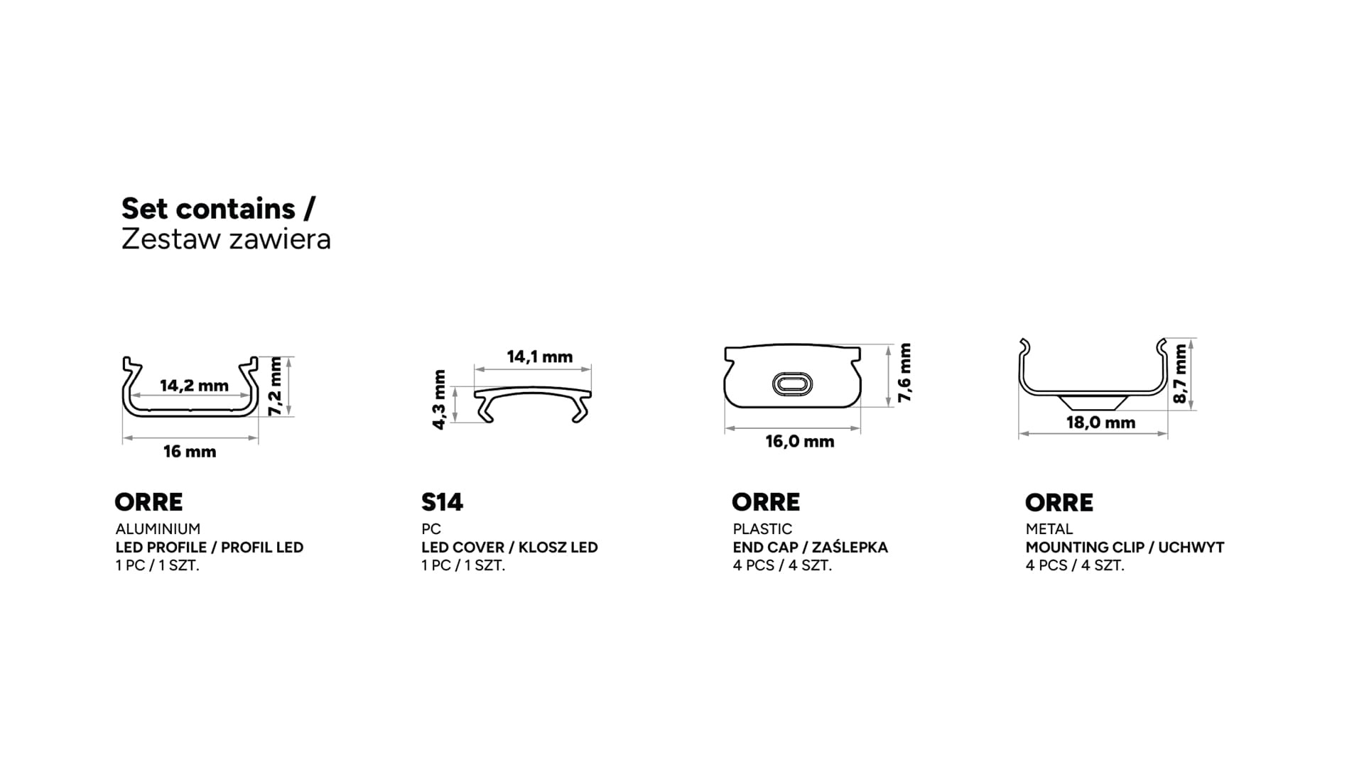 Set contains: 1 x ORRE LED profile, 1 x S14 LED cover, 4 x ORRE End cap, 4 x ORRE Mounting clip
